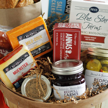 This is one of our favourite baskets. It includes all the comforts of a family faspa: cheese, crackers, bread, jam, pickles, kubassa/dried sausage, and dessert. Perfect for sharing.